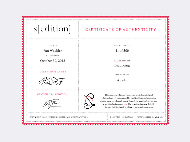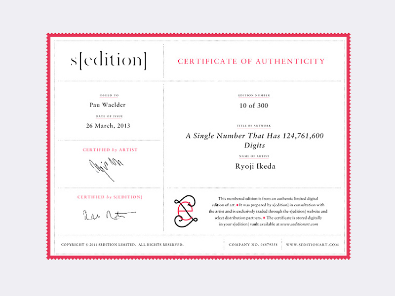 $8,793 Worth of [Art] is a collection of 159 real and false certificates of authenticity, culled from Sedition, an online platform that sells digital editions of artworks. The title refers to the exact amount that would have been paid if all of the works had been bought as the certificates apparently attest. These documents open up a questioning of the notion of ownership and authenticity in the digital era, as well as the traditional methods of the art market.